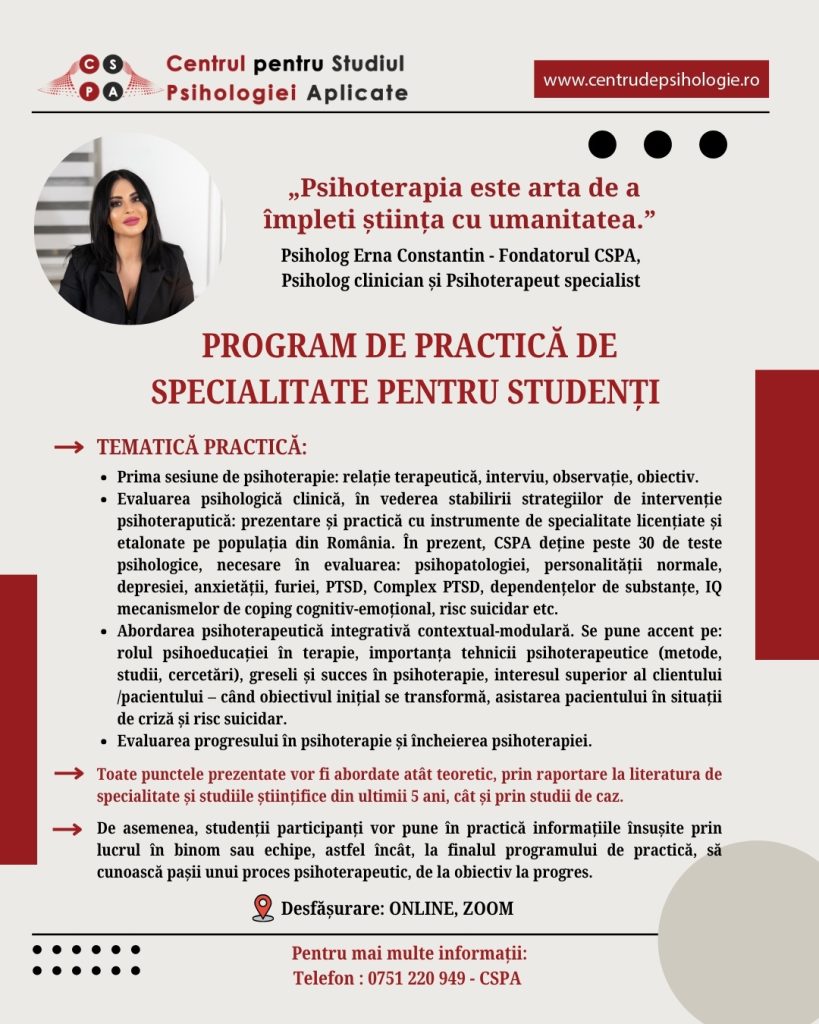 Programul de practică de specialitate, organizat în cadrul Centrului pentru Studiul Psihologiei Aplicate, reprezintă pentru studenții înscriși la Facultatea de Psihologie o oportunitate de a-și dezvolta competențele practice, gândirea critică și capacitatea de a răspunde, într-un mod empatic și responsabil, nevoilor beneficiarului. Structurat riguros și ghidat de un specialist cu experiență clinică și psihoterapeutică, programul își propune să ofere studenților o înțelegere aplicată a procesului psihoterapeutic, de la prima întâlnire cu beneficiarul, la evaluarea clinică, formularea planului de intervenție și până la încheierea procesului psihoterapeutic.