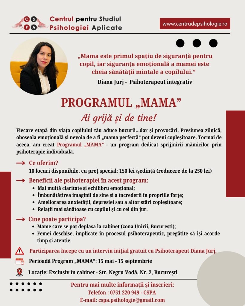 Fiecare etapă din viața copilului tău aduce bucurii…dar și provocări. Presiunea zilnică, oboseala emoțională și nevoia de a fi „mama perfectă” pot deveni copleșitoare. Tocmai de aceea, în cadrul Centrului pentru Studiul Psihologiei Aplicate (CSPA), am creat Programul „MAMA” – un program dedicat sprijinirii mămicilor prin psihoterapie individuală.